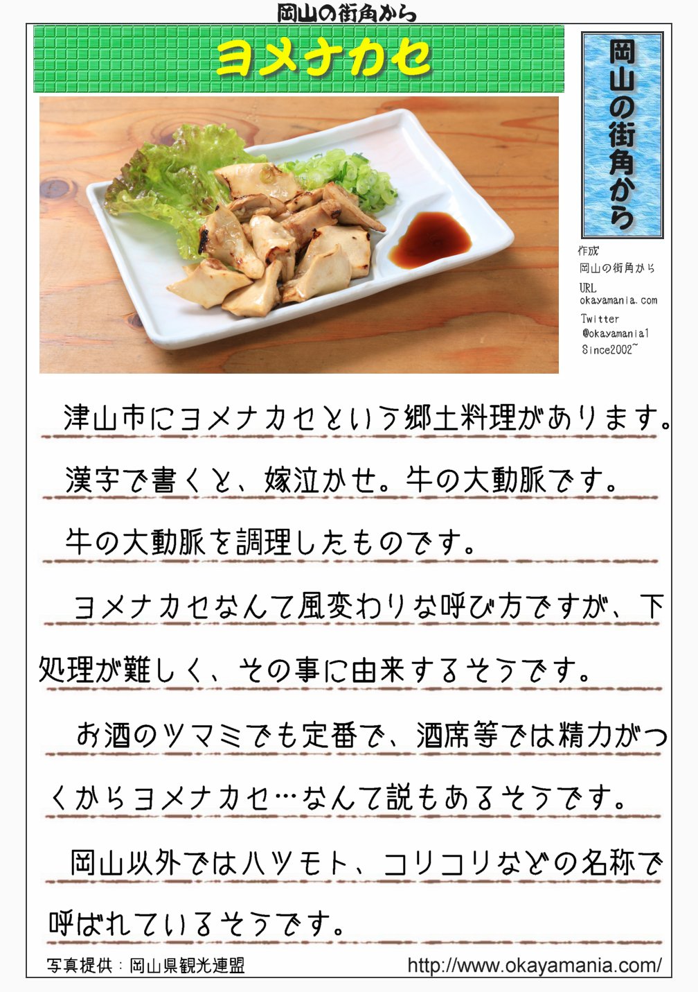 ヨメナカセ ヨメナカセとは|コリコリとした食感で、酒の肴にぴったり!|岡山県ヨメナカセ 岡山の街角から│地名の由来のWEBサイトヨメナカセ onヨメナカセ X:ヨメナカセ 【ヨメナカセ】ヨメナカセ 津山市の郷土料理にヨメナカセがあります。ヨメナカセ ヨメナカセ 変わった名前ですが、漢字で書くと嫁泣かせです。ヨメナカセ これは牛の大動脈を調理したもので、下処理が難しい事から嫁泣かせの名前がついたと言われています。ヨメナカセ ヨメナカセ 岡山以外ヨメナカセ ...ヨメナカセ 写真ヨメナカセ :ヨメナカセ グルメファクトリーヨメナカセ 新琴似店ヨメナカセ -ヨメナカセ 新川その他