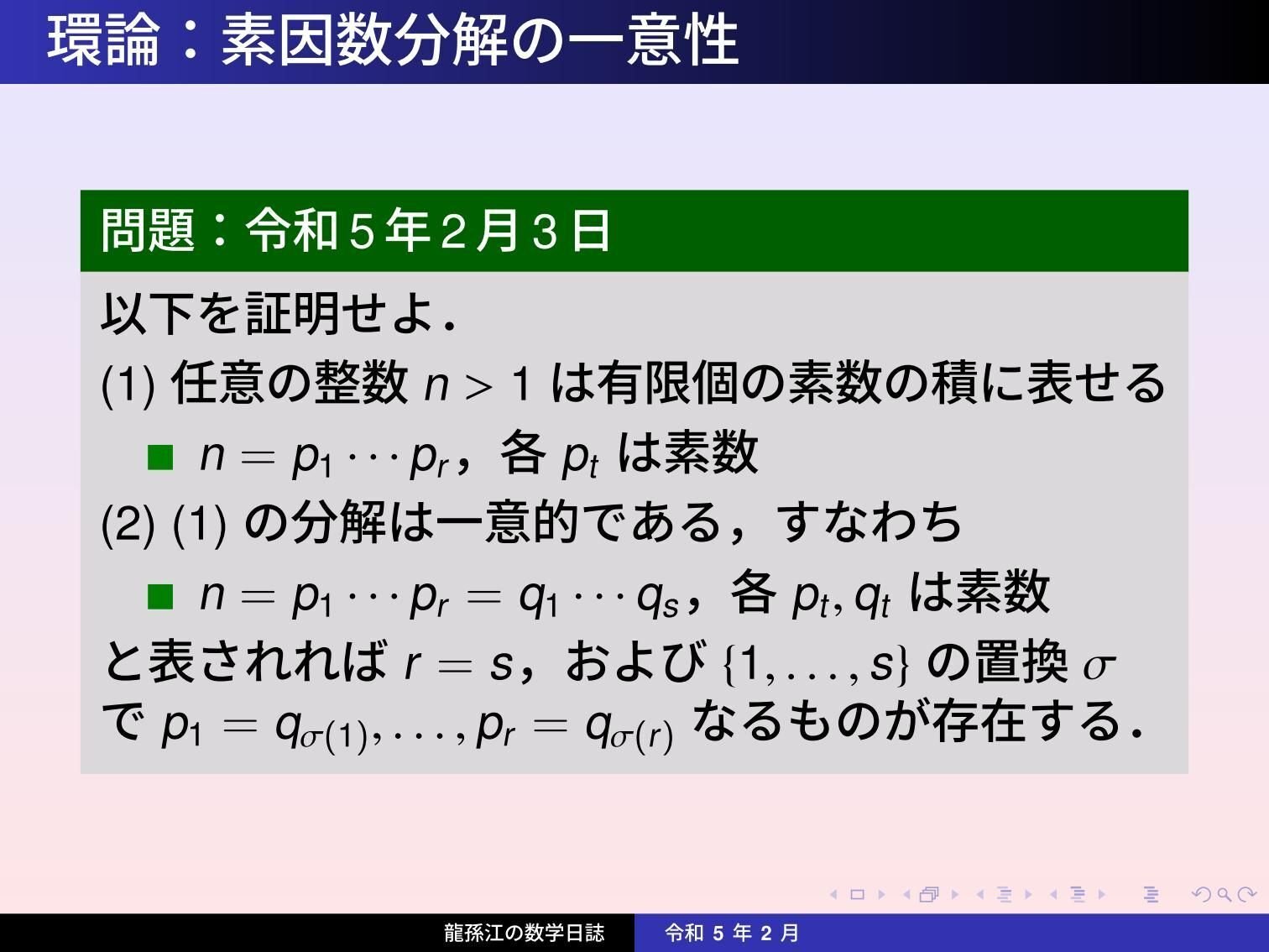 ![tsujimotter 日曜数学者 on X: ゆるにじたい は今日から第5章「2次体における素因数分解」が始まりました! 2次体の整数環の「素数」が定義され、2次体の整数は有限個の素数の積に分解されることが示されました。また、Z[√-5]では素因数分解の一意性が成り立たない ...](https://i0.wp.com/pbs.twimg.com/media/EdiSXwmUYAAD6hs.jpg:large?ssl=1)